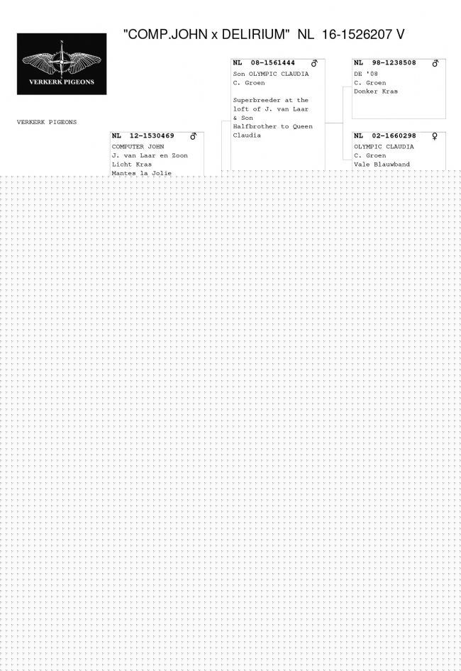 父亲“电脑约翰” 佛科克现役代表种公之一,本身获芒特拉若利551羽冠军、省赛6571羽9位等,作出代表直女“卡拉迪雅公主”获2016年FONDSPIEGEL长距离全国鸽王冠军、2016年PIPA长距离全国鸽王4位、2016年PIPA一岁鸽全国鸽王季军、2016年WHZB-TBOTB长距离全国鸽王亚军、2016年NPO长距离全国鸽王6位、2016年南荷兰省一日长距离全省鸽王冠军等。
