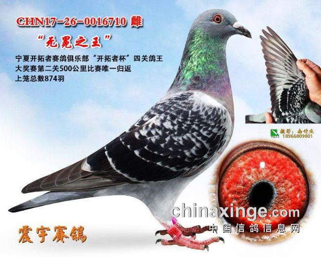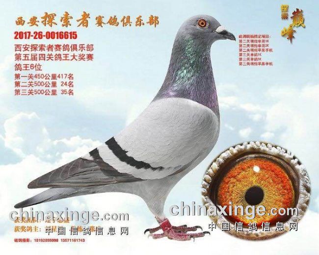 去年(2017年),他的一羽鸽子又夺得西安威力俱乐部五关鸽王季军,西安探索者俱乐部鸽王6名,如此赛绩够让人兴奋不已,可他还有一羽鸽子在宁夏开拓者俱乐部翻越秦岭500公里赛灭关的情况下,第二天单枪匹马杀回,成为唯一归巢的参赛鸽,无冕之王伯马冠军,再令鸽坛震惊,不愧为“震宇赛鸽”,不断地创造震惊。
