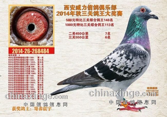 他的鸽子不论打地方赛还是公棚赛,连年进奖,夺得公棚冠军7、8个,前奖无数,近几年打西安威力俱乐部、未央特比环同样取得了优异成绩,详见中信网铭鸽展厅-震宇刘星辰,在此不再叙述。