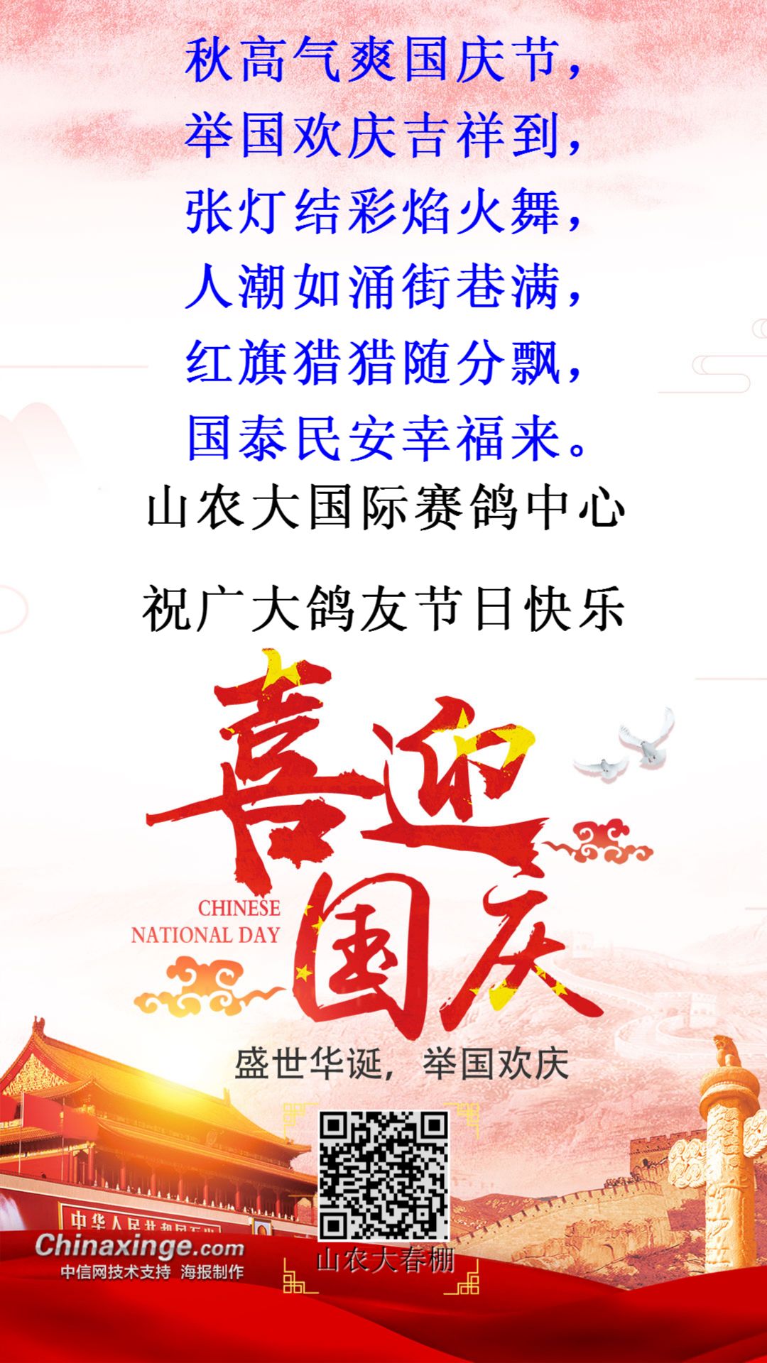 重庆齐圣翔赛鸽中心全体员工祝您国庆节快乐! 四川省遂宁市红军赛鸽公棚祝全国鸽友国庆节快乐!