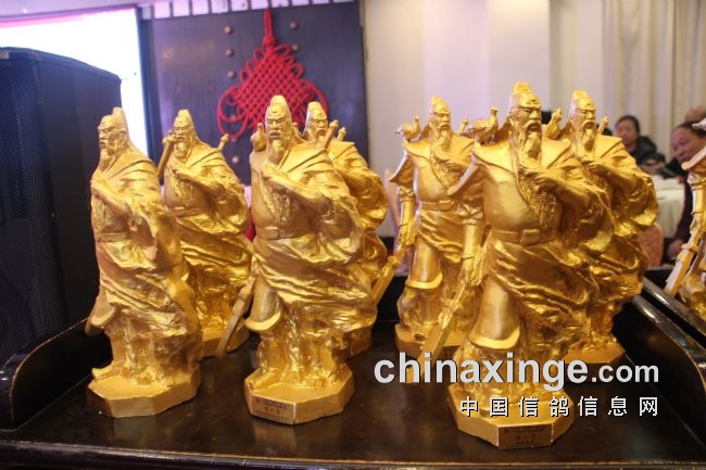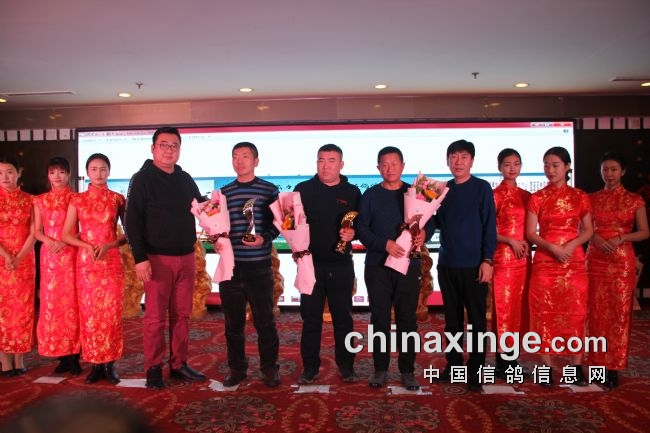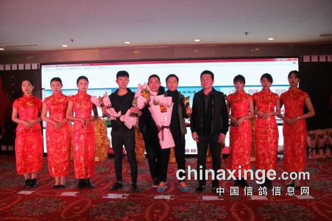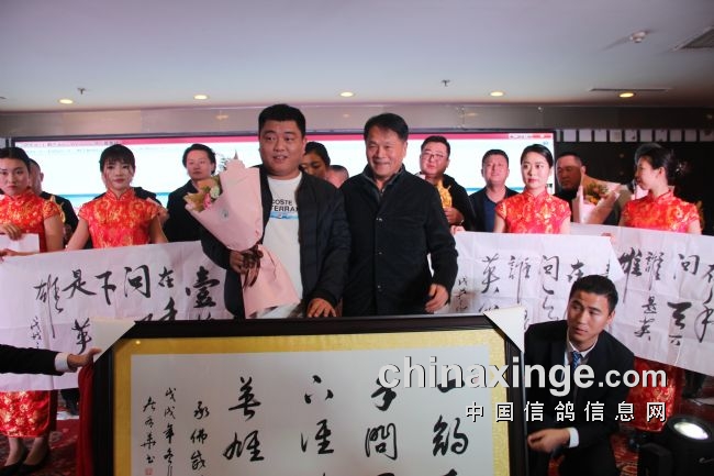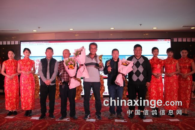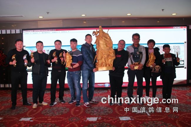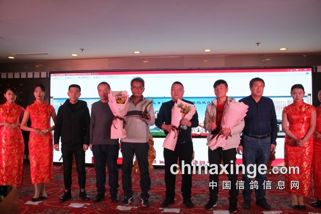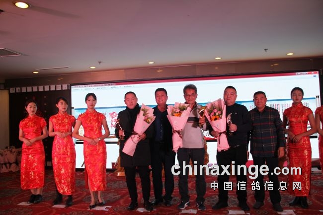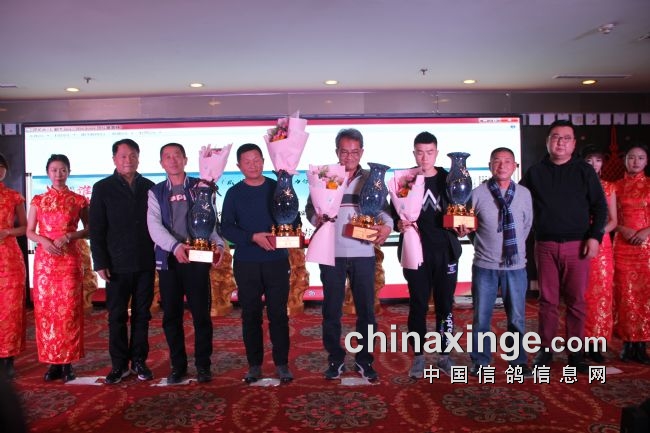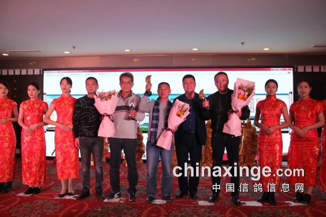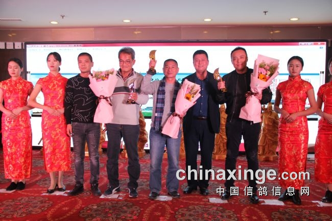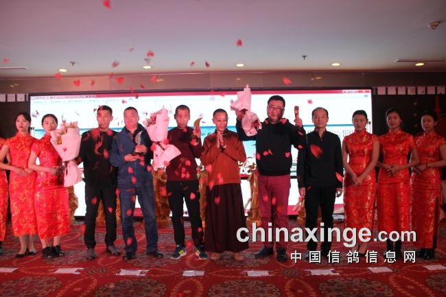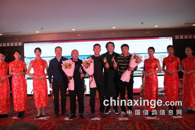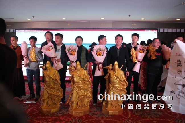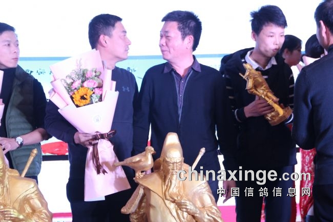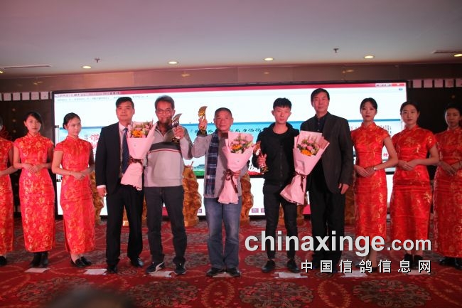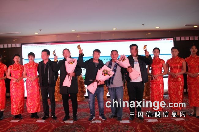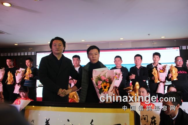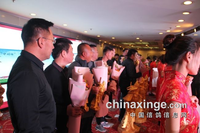 接着,大会开始颁奖活动,在欢庆喜悦的音乐声中,获得前奖的鸽友们陆续走上颁奖台,各级领导和鸽界名人将沉甸甸的奖杯高兴地递到获奖鸽友的手中。