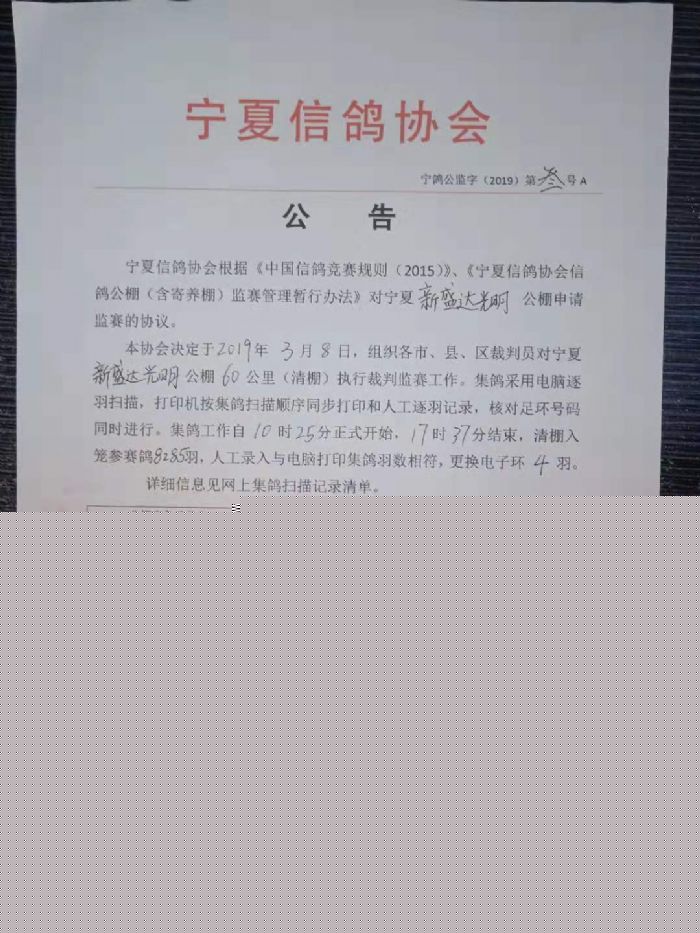 宁夏新盛达光明赛鸽公棚2019年第三届春赛60公里清棚训放,已于3月8日在各市、县、区裁判员的监督下,经过逐羽扫描、核对足环后,共计上笼8285羽赛鸽。3月9日上午8点15分,所有赛鸽在盐池县关家新庄开笼放飞。