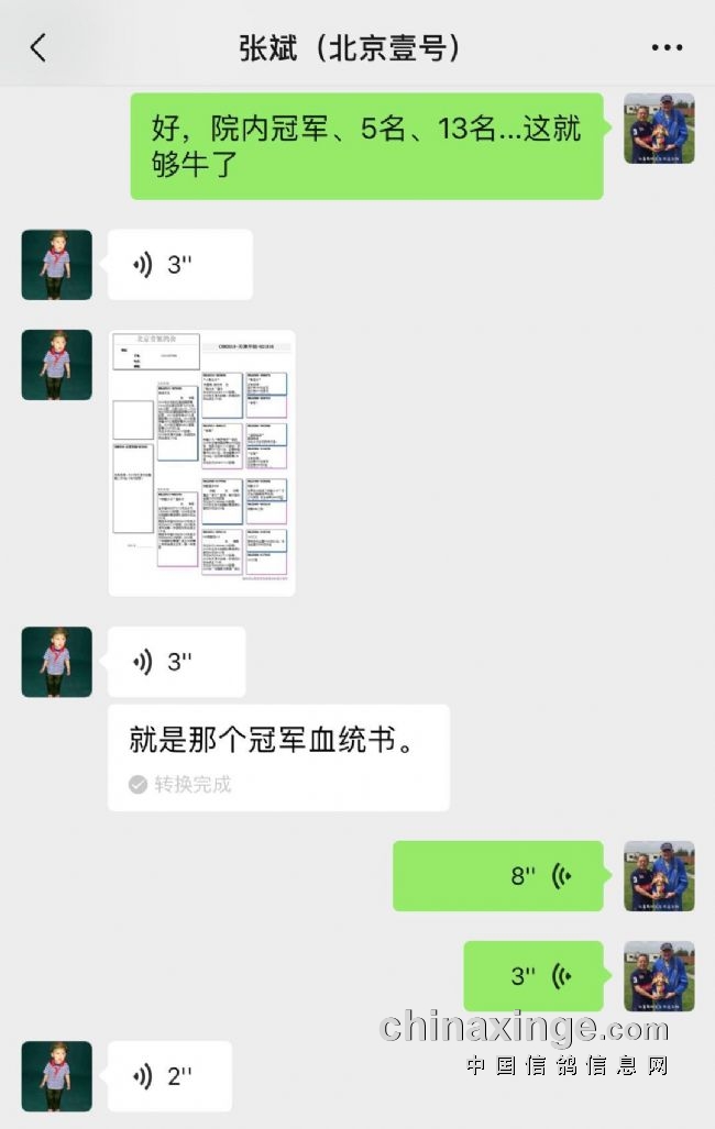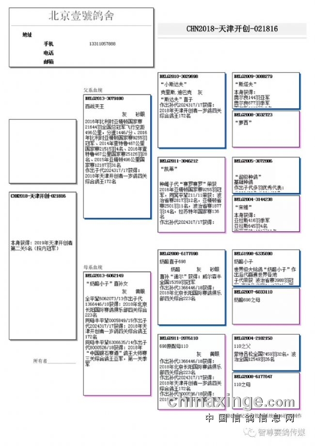 第二关院内冠军的母亲也并非等闲之辈,它虽然没有飞过一公里,但这并不影响它的优秀基因的传承,一个家族血系能红遍中国大江南北必有它的道理,这羽超级赛将的母亲就是现今红遍中国的奶酪鸽系名鸽698直女,这个家族已经不止一次为北京壹号夺得高位大奖。北京壹号-张斌的698家族目前为止仍旧是国内羽数最多的,从2016年在威力获奖到如今的天津开创赛事,一直保持不败的纪录。