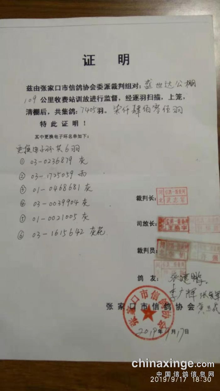 河北张家口盛世达国际赛鸽公棚109公里收费站训放,9月17日在张家口市信鸽协会裁判组的监督进行上笼,经过逐羽扫描核对,共计集鸽7405羽。
