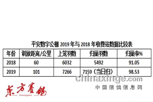 今年百公里收费站放飞距离比去年增加了40公里,距离远了但归巢率却比去年多了7点55个百分点,这证明了今年公棚的鸽子养得比去年好。