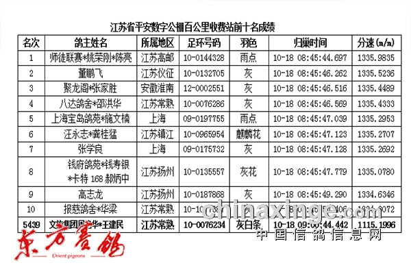 江苏平安数字公棚第10届秋季三关大奖赛百公里收费站今天(10月18日)早上7点30分在安徽明光开笼放飞,7266羽平安勇士激情满怀一试身手。