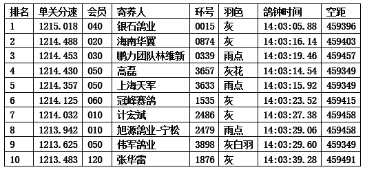 “中国杯”信鸽职业联赛云外水庄首关450公里比赛成绩汇总表