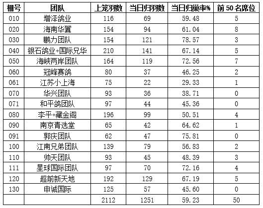 前50个进奖席位在12分钟之内各有其主。截止当晚发稿之时,云外水庄俱乐部首关比赛共回归1251羽,当日归巢率为59.23%,其归巢率虽不是很豪华,但450公里的空距,当日归接近6成,也算是上乘成绩了。从分速看,今天全国各地举行比赛的公棚与协会赛,除了黑龙江地区取得高分速外,其余地区大多在1000至1200米之间,属中规中矩的正常水平,归巢率除百公里一档的比赛尚理想之外,3百公里档预赛和5百公里档决赛加归率均不是很高,可见鸽子在天上飞,影响的原因有很多很多,还有待于人类不断去探索和掌握。