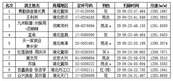 话说今天的比赛十分顺利,冠军于9:23:37.464报到,是湖北襄阳勇勤鸽舍曾化勇鸽友名下的一羽灰鸽,分速达到1293.1697米,离1300相差无几,还是很棒的。