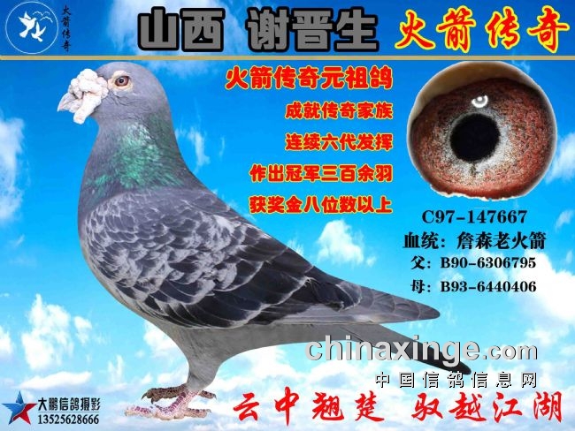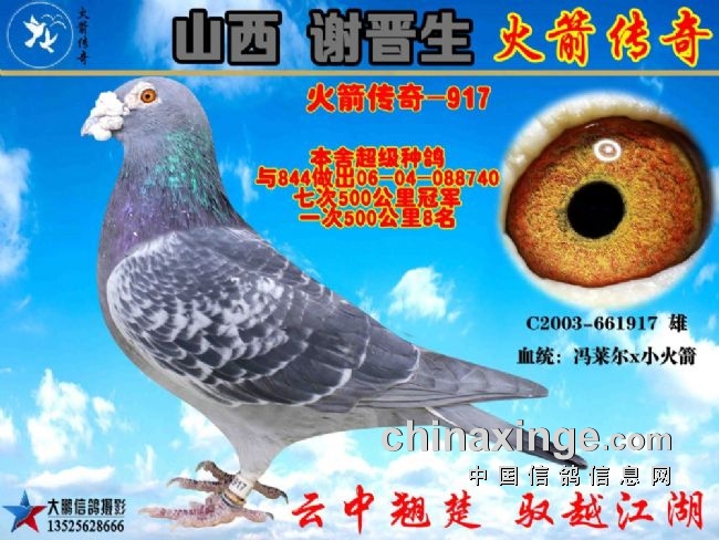 谢晋生老师说,冯莱尔917这种血系的特点就是成绩稳定、耐力十足,遗传能力极强,多年来陪他征战太原及湖北金沙,从来没有让他失望过,成为他摘金夺银,赢取高额奖金的利器,更是他成名的旷世之作。也可以说是老火箭667和冯莱尔917让他功成名就,多年来在全国各大赛场立于不败之地,创造了中国鸽界一个又一个的神话。这是一个职业赛鸽家养鸽生涯中最值得欣慰和骄傲的事情,许多养鸽人穷其一生都没办到的事情,他都办到了。虽然自己抛弃了自己的事业,但皇天不负有心人,上帝在关了一扇门的同时,却为他打开了一扇窗户,赛鸽事业将他推上了人生的巅峰,他苦着累着并快乐着,衣带渐宽终不悔。老骥伏枥志在千里,接下来他要做的事情就是继续征战西安威力、北京开创、唐山开尔等各大赛场,争取让火箭传奇家族再续辉煌。
