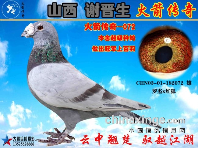 中信网太原讯(专栏作家吴建军)传奇名鸽老红鬼自身是陕西联华公棚决赛3名,血统为比利时珍珠罗杰富雷卡X詹森红狐狸,环号CHN2003—01—182072,谢晋生当时以5万元的高价拍得。本身血统高贵翔绩出众,与老火箭完美组合,已经发挥至第七代,子代后代已经作育出冠军百余羽。因其羽色为漂亮的红轮,且经常在湖北金沙、北京开创、西安威力等全国各大高端赛事中神出鬼没般夺得高位奖,被谢晋生视为棚中的秘密武器,故美其名曰老红鬼。