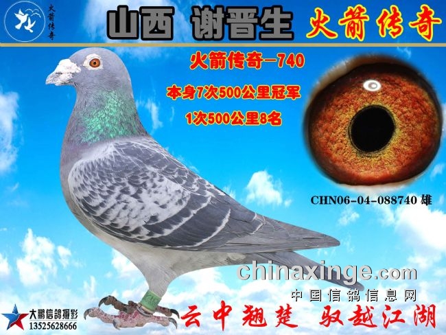 七次冠军火箭740是谢晋生火箭传奇家族“龙城飞将”之一,环号CHN2006-04-088740。其父亲是冯莱尔917,母亲是老火箭女儿火箭844。火箭740参加山西省信鸽协会、太原市信鸽协会、山西火车头信鸽协会500公里七次冠军、一次八名。