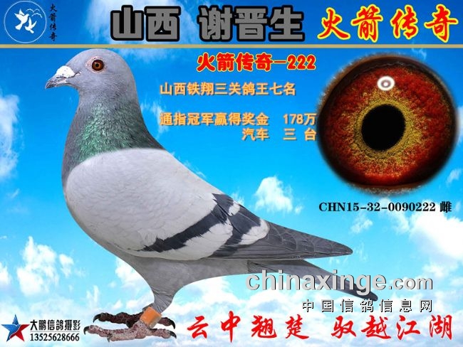 与此相似,有些鸽界名家的优良赛鸽在各大赛场中,也能凭借着优良的血统、顽强的毅力,在数万羽大赛中先声夺人,甚至单枪匹马赢得大奖,与李广、卫青等龙城飞将有得一比。山西谢晋生火箭传奇家族多年来以老火箭667、老红鬼072、桑杰士916、冯莱尔917四大金刚为基因库,以灵武鸽王887、优龙鸽王514、德国鸽王753、戴扶连特995黄金库,始终坚持“远亲近靠、杂交出赛”的育种竞翔理念,将这八路黄金血系相互穿叉使用,培育出根深叶茂、盘根错节的冠军鸽王黄金家族,作育出无数个鸽界的“飞将军”,其中以七次冠军火箭740、汽车冠军火箭222等数羽在太原市鸽会、铁翔俱乐部等各级别比赛中屡获大奖,为主人赢得无数荣誉的“龙城飞将”为代表,是谢晋生火箭家族中名副其实的赢钱系,其子孙后代在北京开创、武汉金沙、西安威力等全国顶级赛场及北京爱亚卡普、宁夏黄河中卫等高端赛事中均有上乘表现,成为火箭传奇家族的继承者和生力军。