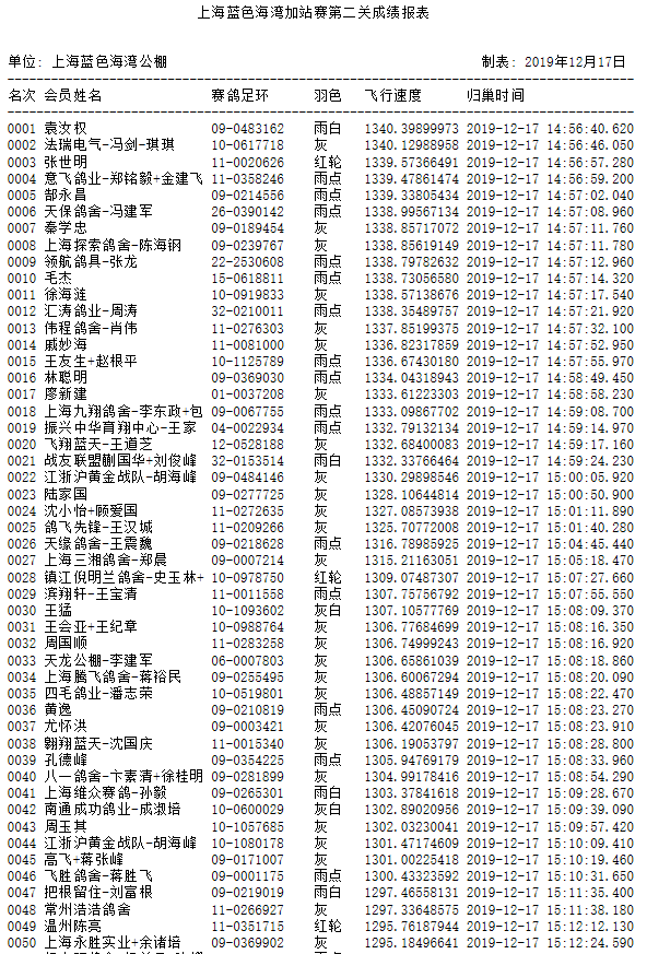 第二关加站赛605公里,集鸽2315羽,于12月17日放飞,冠军于当天下午14:56分归巢,分速1340米/分。