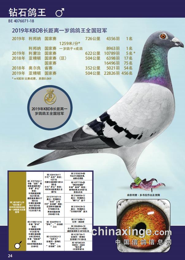 “钻石鸽王”BE18-4046071,无疑是2019年国家赛长距离最优秀一岁鸽!获得2019年KBDB长距离一岁鸽鸽王全国1位。19年莱邦纳国家赛726公里4356羽1名、19年利蒙治国家赛622公里10789羽5名、18年亚精顿国家赛504公里16496羽75名。