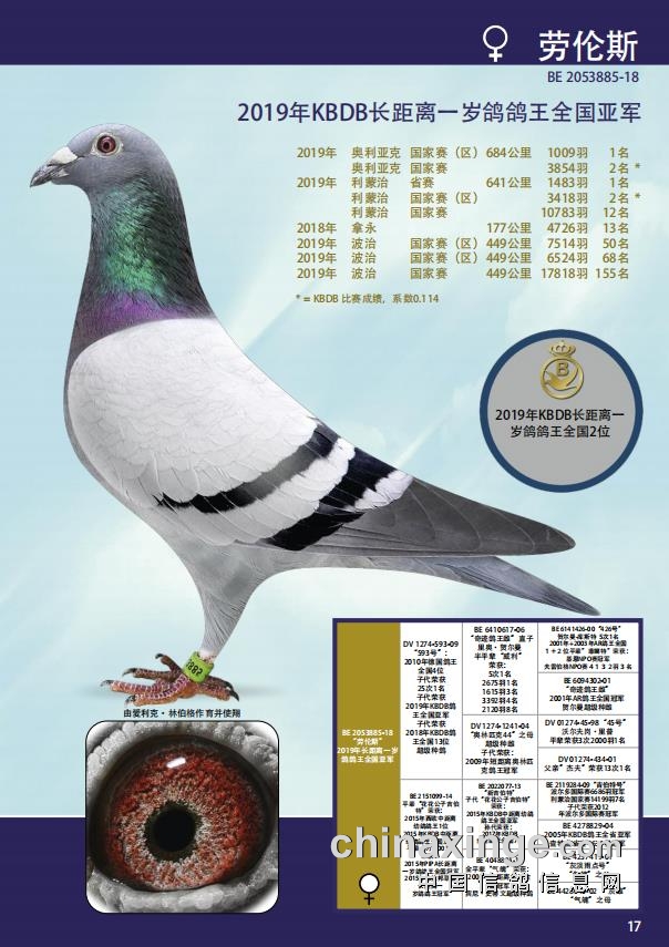 “劳伦斯”BE18-2053885,获得19年KBDB长距离一岁鸽鸽王全国2位,19年苏雅克国家赛3854羽2名,利蒙治国家赛10783羽12名。