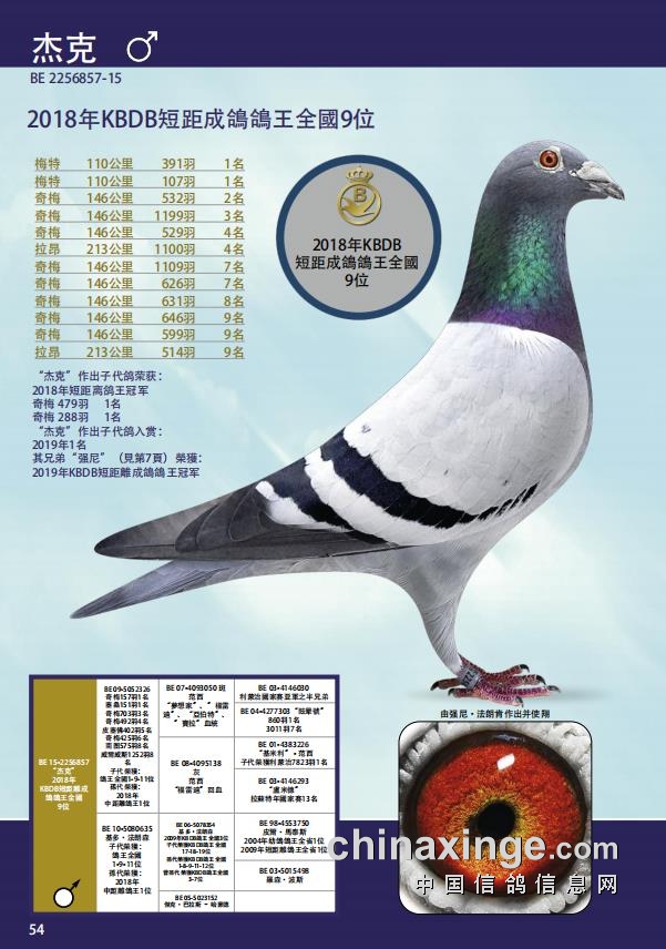 “杰克”BE2256857-15,上述KBDB全国鸽王“强尼”的全兄弟鸽,其表现完全不输其兄弟,“杰克”本身获得18年KBDB短距离老鸽鸽王全国9位的佳绩。