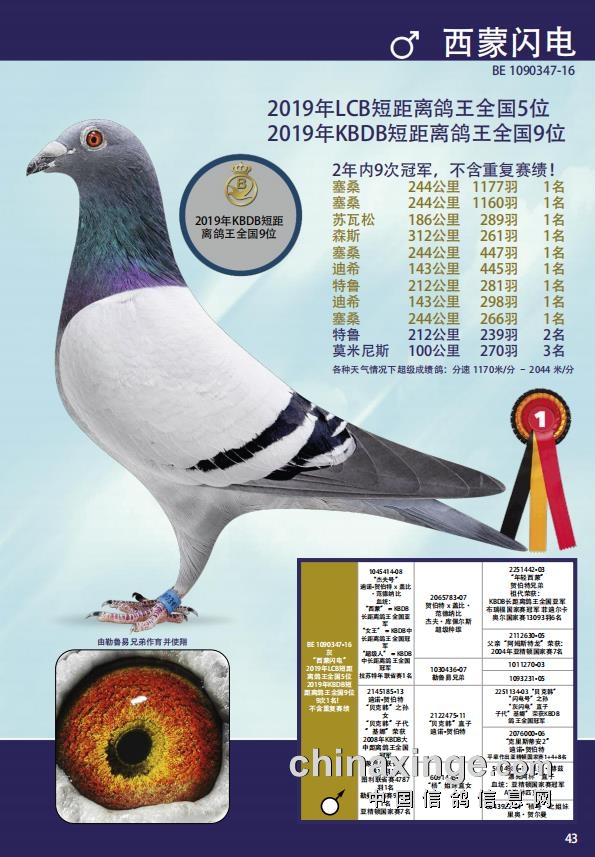 “西蒙闪电”BE1090347-16,流有赢家血统,2季中获得:9次短距离赛和中距离赛1名,参赛羽数自260羽至1200羽。
