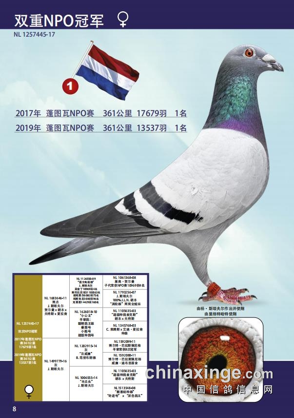 “双重NPO冠军”NL1257445-17,世界级顶尖赛鸽,2017年蓬图瓦NPO 17679羽1名、2019年蓬图瓦NPO 13537羽1名。
