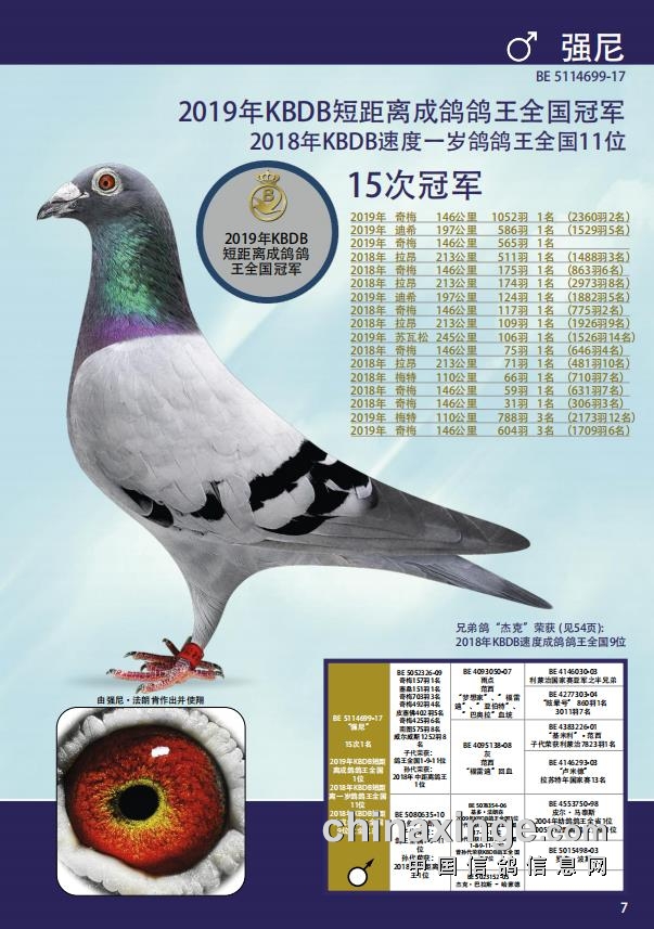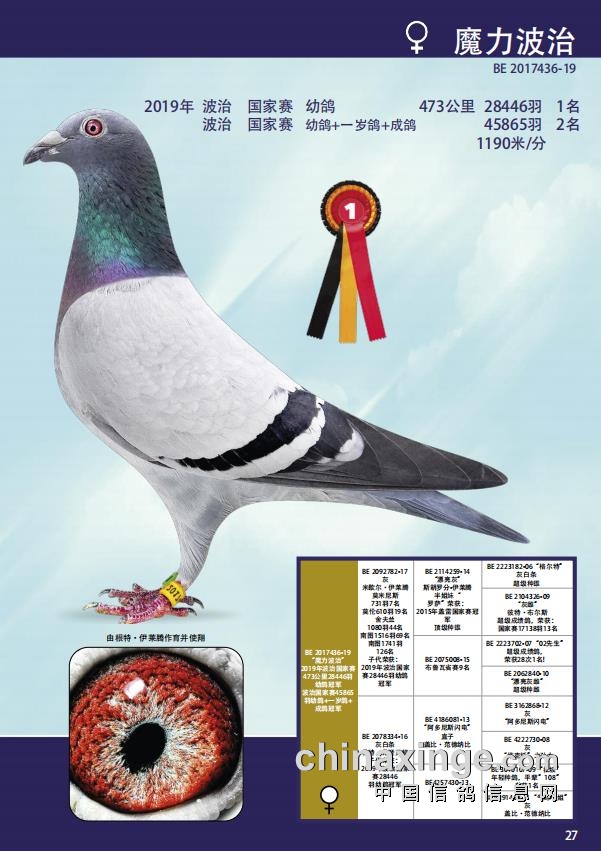 “魔力波治”BE19-2017436,2019年获得知名的幼鸽国家赛冠军!波治国家赛28446羽1名,波治45865羽最快速鸽2名。