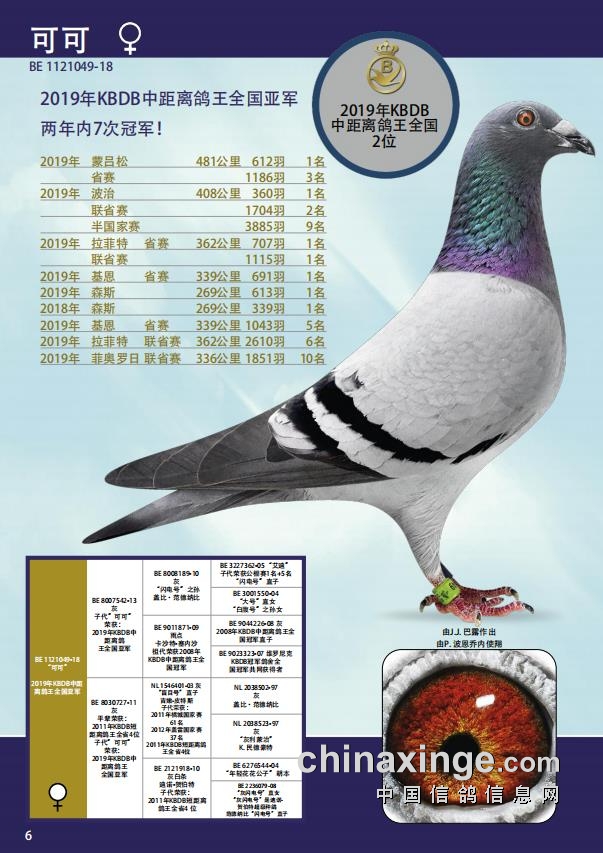 “可可”BE1121049-18,一羽令人惊叹的雌鸽,获得7次1名,以及19年KBDB中距离鸽王全国2位的佳绩。