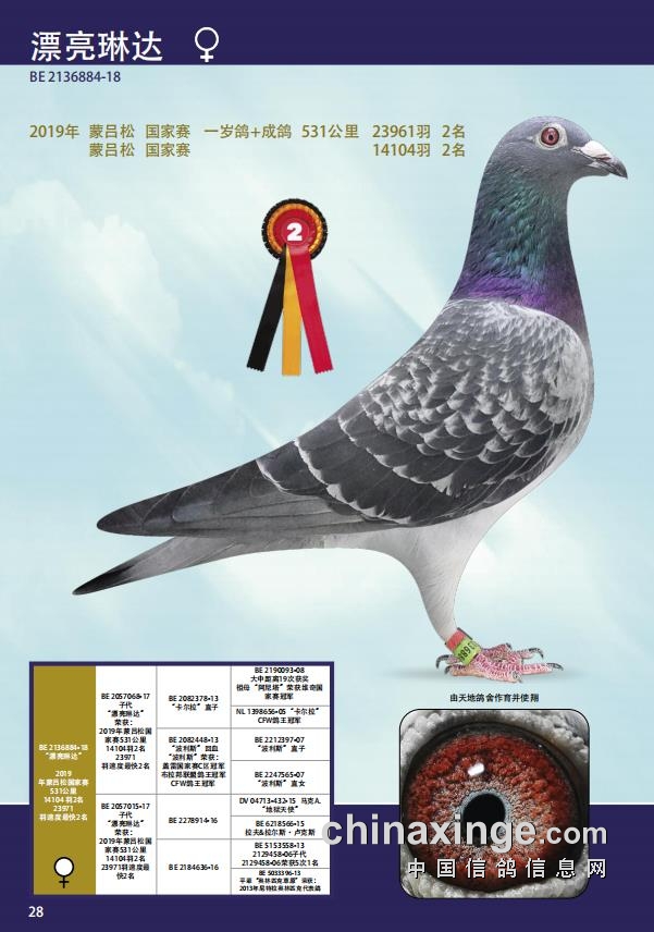 “漂亮琳达”BE18-2136884,获得19年蒙吕松国家赛531公里一岁鸽组14104羽2名,23961羽最快速鸽2名。