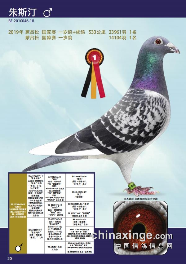 “朱斯汀”BE18-2010046,超级优胜鸽,获得19年蒙吕松国家赛533公里一岁鸽组14104羽冠军,老鸽组+一岁鸽组23961羽最快速鸽。