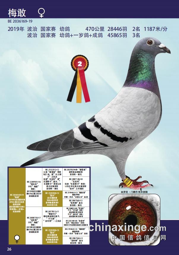 “梅敢”BE19-2036169,获得2019年波治国家赛幼鸽组28446羽2名,波治45865羽最快速鸽3名。