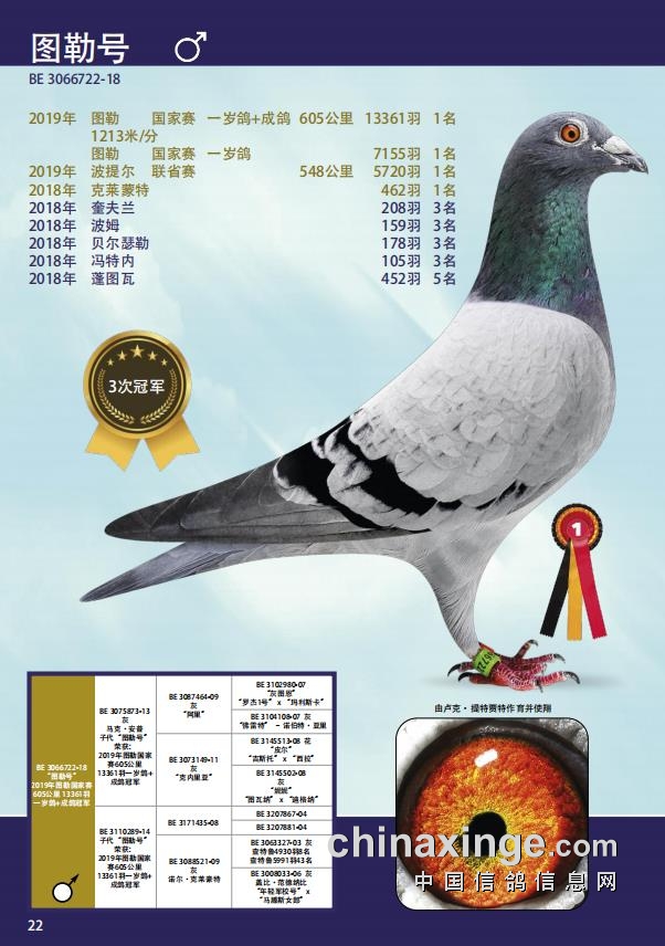 “图勒号”BE18-3066722,一羽力抗数千羽对手的冠军鸽,获得19年土勒国家赛605公里一岁鸽组7155羽1名(13361羽最快速鸽),亦获得波提尔联省赛5720羽1名,克莱蒙462羽1名。