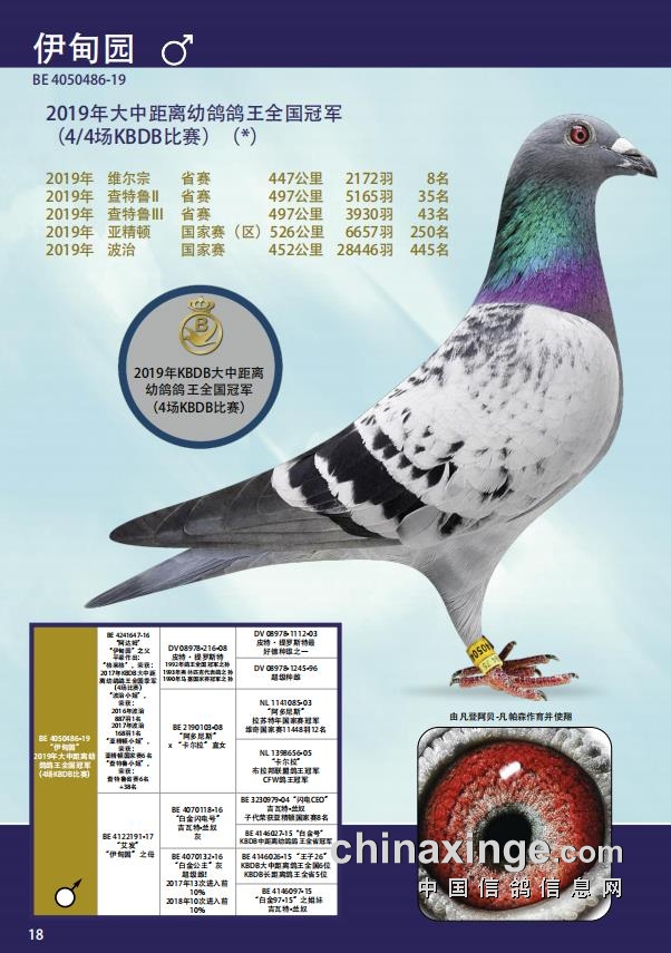 “伊甸园”BE19-4050486,如果计入4次国家赛幼鸽组赛绩,那么这羽顶级赛鸽就能以4次国家赛赛绩荣获2019年比利时最优秀幼鸽。