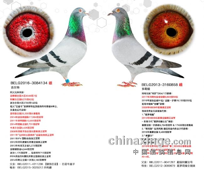 亚精顿I国家赛一岁鸽26085羽18位与36位,同时,它们还是萨布瑞斯458公里一岁鸽3350羽4位与查特鲁I国家赛一岁鸽33220羽275位,均出自配对【吉尔特】×【葛萝莉娅全姐妹】直女,佛斯特拉与盖比血系的强强结合。