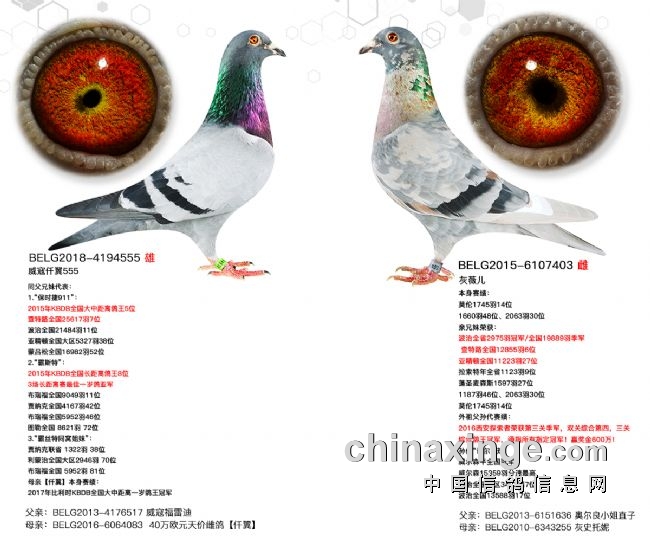 这对亲兄弟的父亲为开尔引进的超级雌【仟翼】的直子,2019年回到国内开尔育种中心,2020年搭配杨欧瓦克黄金配对【800×301】的后代,作育的第一窝小鸽征战山西神齐。母亲【灰薇儿】为【奶酪小子直子698】的外孙女,一羽超级赛雌。