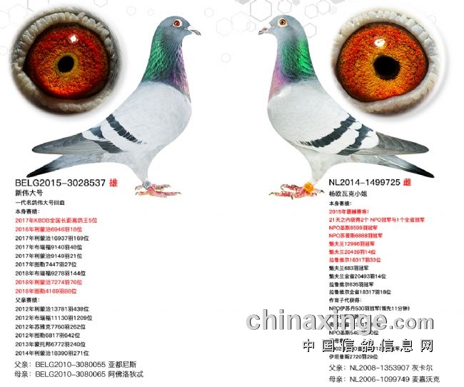 这对亲兄弟的父亲【新伟大号】来头不小,赛鸽名家诺尔·利本斯唯一认可鸽中吕布,一代名鸽【伟大号】回血,本身获得2017年PIPA排行榜长距离鸽王冠军荣耀,母亲是2015年震撼赛将,21天之内获得2个NPO冠军与1个全省冠军的【杨欧瓦克小姐】,这对亲兄弟可谓铭血后代,不容小觑。