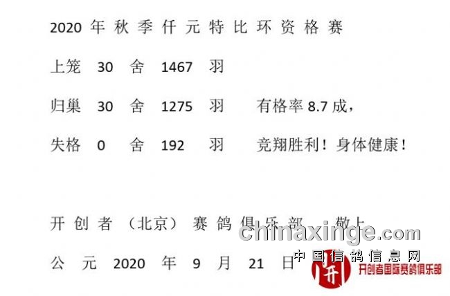9月21日早上06:28,2020年开创者“铁鹰三关”仟元特比环资格赛在河北省赵县东开笼,最终共有30舍的1275羽参赛鸽通过资格赛比赛,归巢率达86.91%。