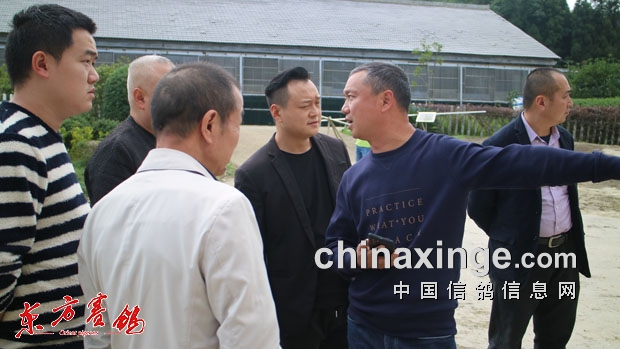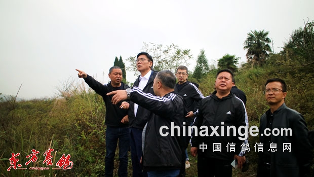 ▲翠枫园董事长姜军(左一)向中鸽协邢小泉会长(左二)清镇市委常委张涛、清镇市政协副主席黄健等嘉宾站在高处俯瞰正在兴建翠枫园赛鸽俱乐部
