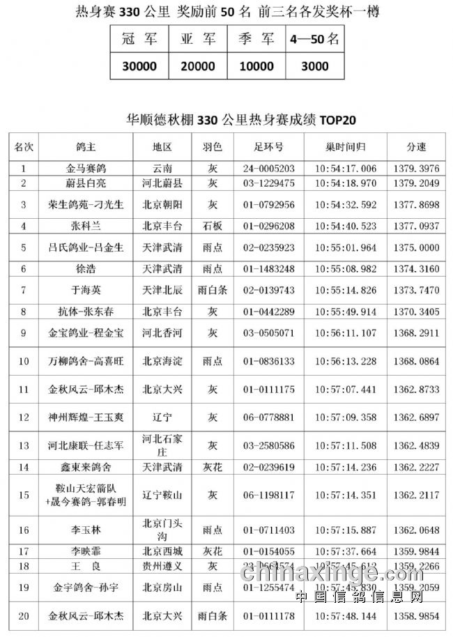 精英赛报名及确定环号截止本关热身赛集鸽上笼前,共报名368羽参赛,决赛精英赛奖项将在第三关决赛中产出,名次前者为胜,取前40名,取满有奖名额为止。
