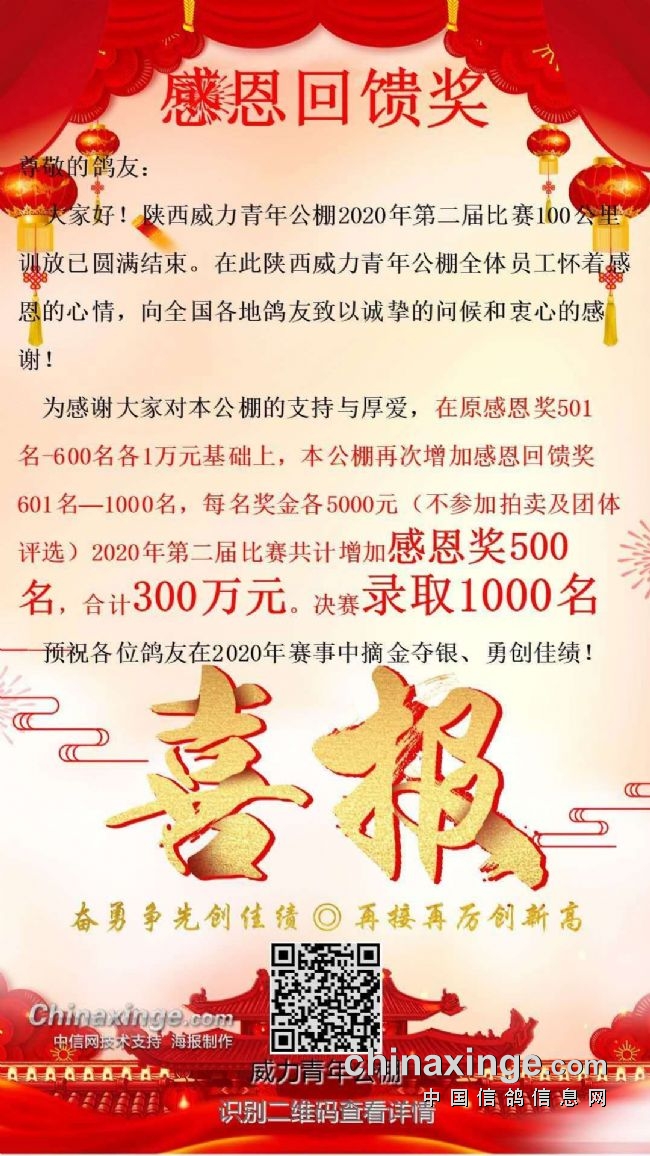 为感谢大家对本公棚的支持与厚爱,在原感恩奖501名-600名各1万元基础上,本公棚再次增加感恩回馈奖601名—1000名,每名奖金各5000元(不参加拍卖及团体评选)2020年第二届比赛共计增加感恩奖500名,合计300万元。