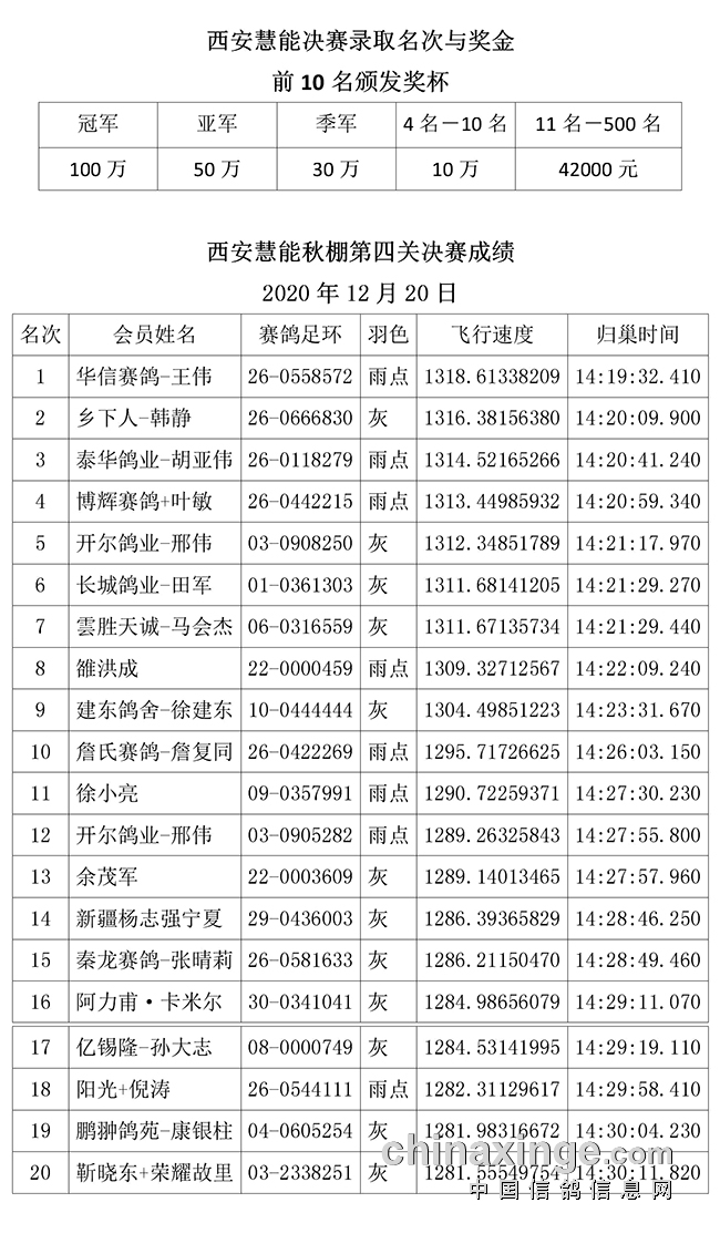 西安慧能今日(2020年12月20日)决赛最大的赢家当属冠军西安华信赛鸽---王伟,他的环号为2020-26-0558572雨点在第一梯队三羽鸽子同时归来,但这羽功勋战将没给另外二羽同伴机会,落棚、踏响鸽钟几乎是一气呵成,以冠军身姿傲立群雄,同时鸽主人也似乎心有灵犀,在四羽决赛鸽中.对这羽情有独钟,打了22项通指,指定赛获奖300多万,加决赛奖金总奖金400多万,成为慧能公棚本赛季最大的赢家。