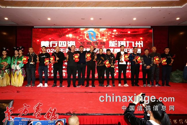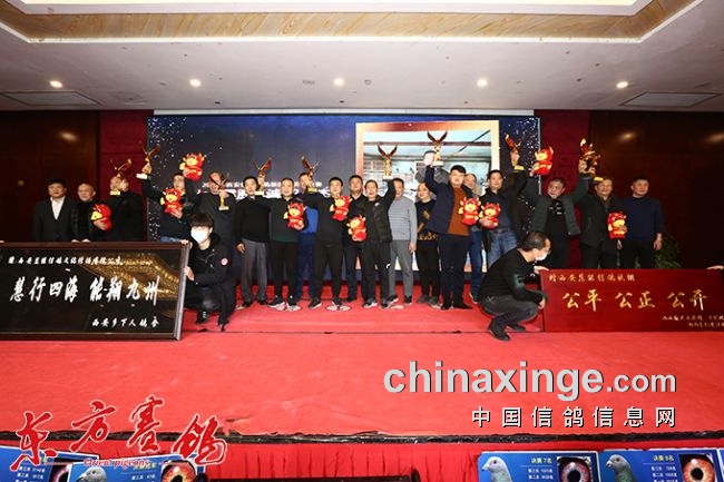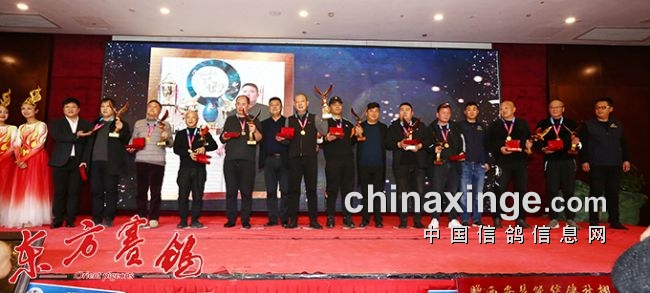 董事长霍新余、嘉宾陆建阳等为决赛前十名获奖鸽友颁奖。