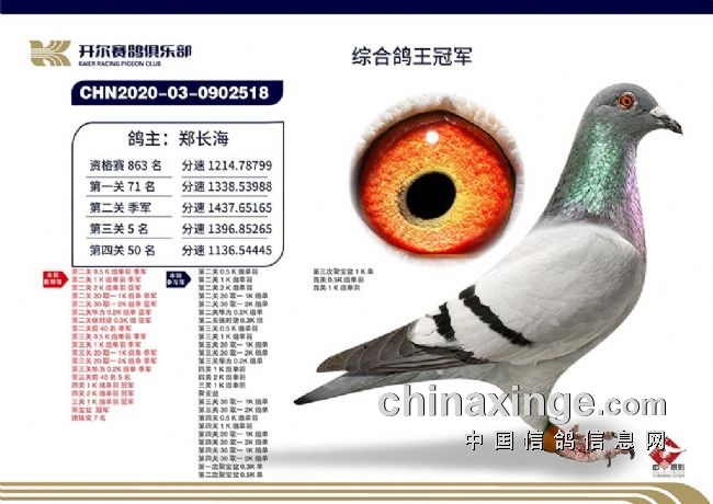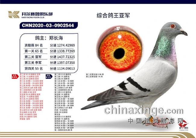 2020年唐山“开尔杯”职业联赛中,郑长海表现突出,先声夺人赢得资格赛冠军,正关赛连续发威,获得首关院内冠军,二关亚、季军,三关3-7名、9名,四关院内9名。四关综合成绩,前200名综合鸽王入围21羽,获得鸽王总冠军、总亚军、5、20、21、31、34、39、41、47名等高位名次。