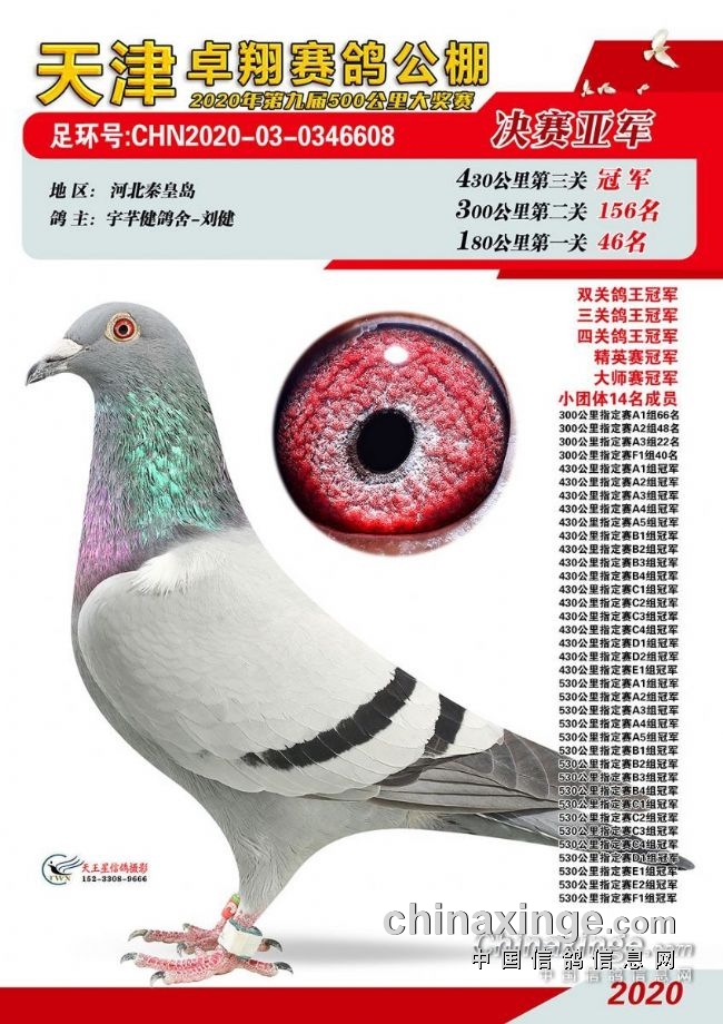 10月24日,天津公棚又一羽“神奇小鸟”诞生!天津卓翔公棚530公里决赛,宇芊健鸽舍-刘健的预赛冠军鸽03-0346608灰鸽,再次获得决赛亚军,将精英赛冠军、大师赛冠军、双关冠军、三关冠军、四关鸽王冠军一并收入囊中,同时预赛、决赛指定通炮,拿下总计39项冠军头衔。[详情]