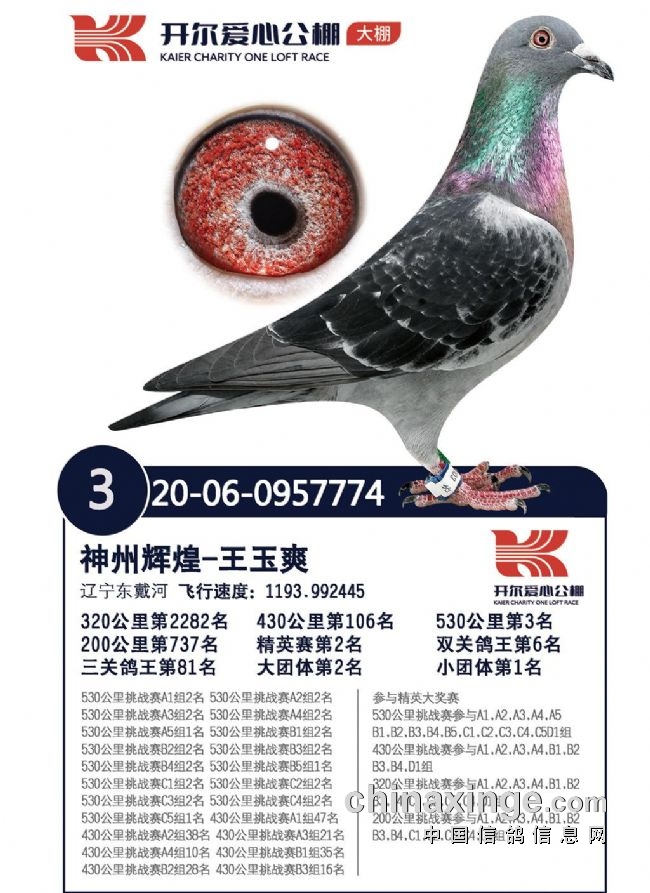 2020年超级大赢家——神州辉煌王玉爽,在开尔大棚继去年赢得决赛亚军后,今年再次获得决赛季军、精英赛亚军。他的这羽爱鸽在二关、三关豪夺20多项指定大奖!此外,另一羽爱鸽也强势夺得10名高位,前600名更是强势进奖11羽,获得大团体亚军、小团体冠军![详细]