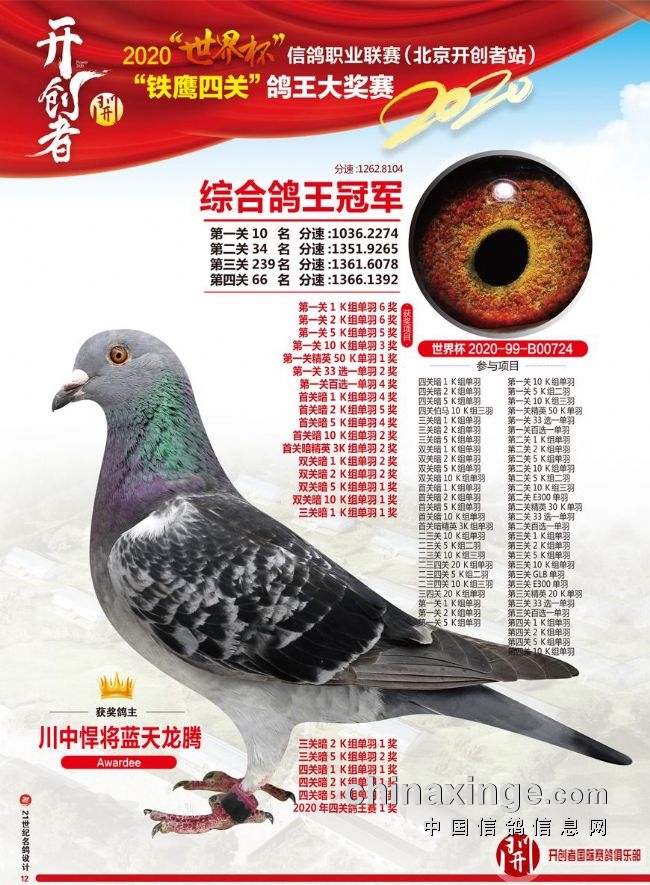 北京开创者“铁鹰四关”鸽王大奖赛,在双关、三关综合排名均在第三位的久盟团队川中悍将蓝天龙腾麾下的00724赛鸽,飞出了1262.8104米/分的平均分速,以领先1.5米/分的优势,力压群雄,逆转拿下鸽王总冠军,四分名次分别是资格赛15名、一关10名、二关34名、三关239名、四关66名。[详情]