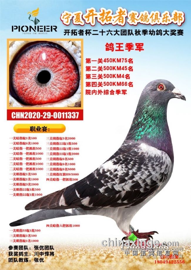 宁夏开拓者四关鸽王赛中,张优团队川中悍将的一羽2020-29-0011337雨点鸽,成绩:一关450公里第75名、二关500公里第45名、三关500公里第4名、四关500公里第66名,飞出了1211.6550米/分的平均分速,获得院内外四关综合总季军。[详情]