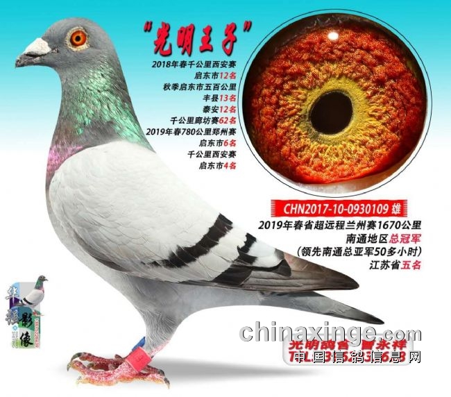 “光明王子”,环号CHN2017-10-0930109,灰色黄眼雄鸽,鸽主是南通启东市光明鸽舍曹永祥。此鸽在2018、2019年连续两年参加千公里获得高位成绩,2019年在兰州超远程比赛中获得南通地区总冠军、江苏省五名。