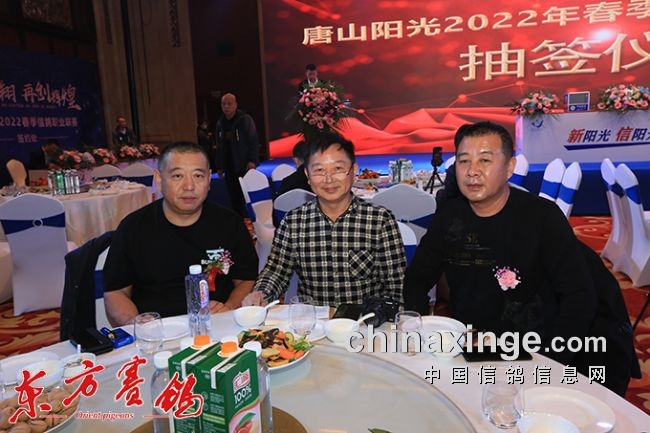 2022年春赛奇养棚抽签仪式现场年冠鸽粮董事长田罡、唐山阳光集团董事长王秀强、拍卖师马鹰合影。