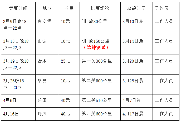 今年春季,吴忠市信鸽协会举办四关鸽王赛,设有300公里、500公里、510公里、600公里四关赛程,单关各自取奖,鸽王综合奖励前十名,前十名发奖杯,奖金。冠军5000元,亚军3000元,季军2000元,4-10名各1000元。宁夏君翼公棚赞助比赛,鸽王前十名各奖励参赛卡一张。