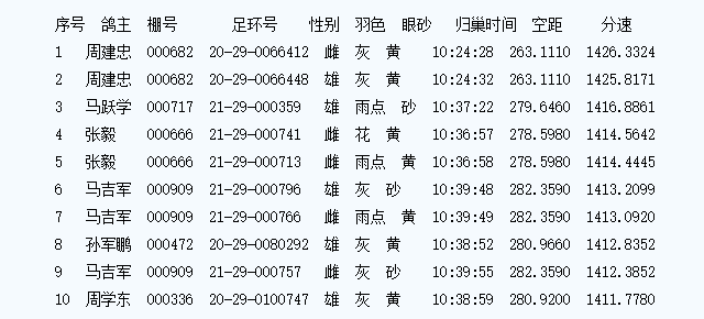 根据直播平台显示,10点24分,周建忠的一雌一雄先后相隔4秒钟归巢报到,暂列第一、第二名,最高分速1426.3324米/分。马跃学的21-29-000359雨点雄鸽,获得第三名。截至11点,比赛已报到1800多羽。前十名数据如下: