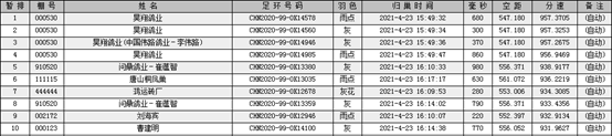 鸽友们的心情也随着天气的阴郁忐忑起来。归巢地久久不见归鸽,分速一路下跌,从1500米/分、1300米/分一路直降到1000米/分大关,所有人都在焦急等待着,15时49分,第一梯队4羽赛鸽的降临。昊翔鸽业麾下两员大将率先入棚,拿下此次比赛的冠军和亚军。冠军是环号2020-99-OK14578的雨点,于15:49:32入棚,分速957.37米;亚军是环号2020-99-OK14560的灰鸽,于15:49:34入棚,分速957.32米。来自伟路鸽业李伟路麾下的勇士环号2020-99-OK14946的灰鸽紧随其后,于15:49:36入棚,以分速957.26获得季军。25分钟后,第10名赛鸽回归。1小时24分钟后,第100羽赛鸽才回归。从这些数据管中窥豹,今日赛况何等艰难可见一斑。截止当晚21点,共计回笼144羽,归巢率32.80%。预计随着天气转好,24日会中午12时共归巢189羽,有格归巢率率 43.05%,此后最后一关征战安阳站,争夺四关综合鸽王120个名次。如果决胜关有效归巢率在66左右,那所有的有效归巢鸽将登上四关综合鸽王宝座。