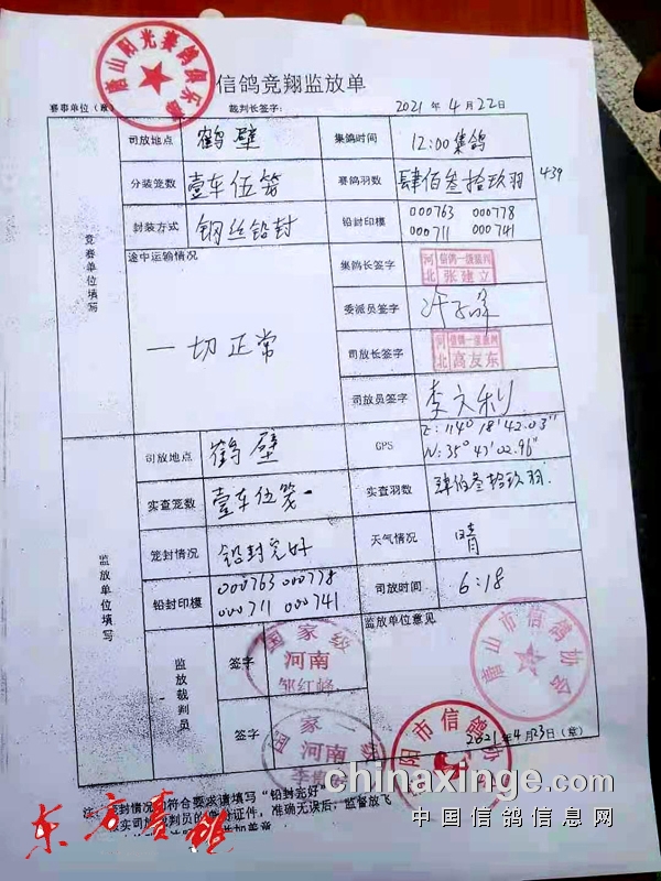 4月23日06时18分,鹤壁市淇滨区的大地上迎来了久违的阳光。经历20号和21号连续两天降雨,当天的早晨格外晴朗。司放长一声令下,439羽健将脱笼而出,稍作盘旋便齐齐朝着唐山方向振翅而去。司放地坐标: N35°47’02.96″E: 114。18’42.03″,俱乐部坐标: N39°41′42.20″S: 118°12′43.33″,实际空距:553.57公里。放飞时虽然有2-3级微风,但天气十分晴朗,谁都会觉得将会是一场一帆风顺的归巢之旅。但天有不测风云,为这场比赛埋上了突如其来的阴影。